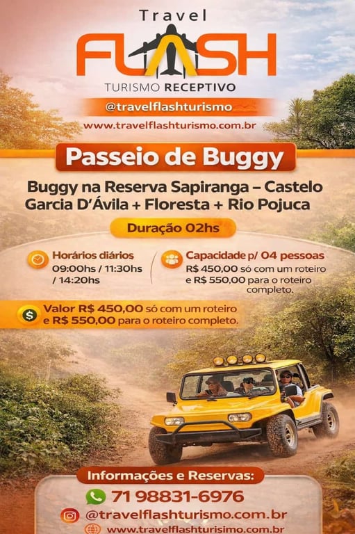 Não perca a chance de explorar o litoral de uma maneira diferente e emocionante. Reserve agora mesmo o seu Passeio de Buggy e prepare-se para uma aventura inesquecível na Praia do Forte. Para reservas e mais informações, entre em contato pelo WhatsApp: (71) 98831-6976 ou visite nosso site www.travelflashturismo.com.br. Siga-nos no Instagram @travelflashturismo e fique por dentro das novidades e promoções. Faça sua reserva online agora e garanta seu lugar nesta incrível jornada pelo litoral norte da Bahia!